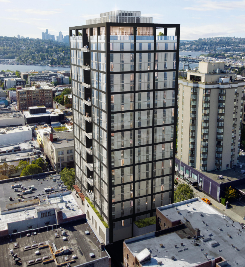 Construction of a 23-story mixed-use highrise building with 342 apartments, retail space, and 53 accessory parking spaces.