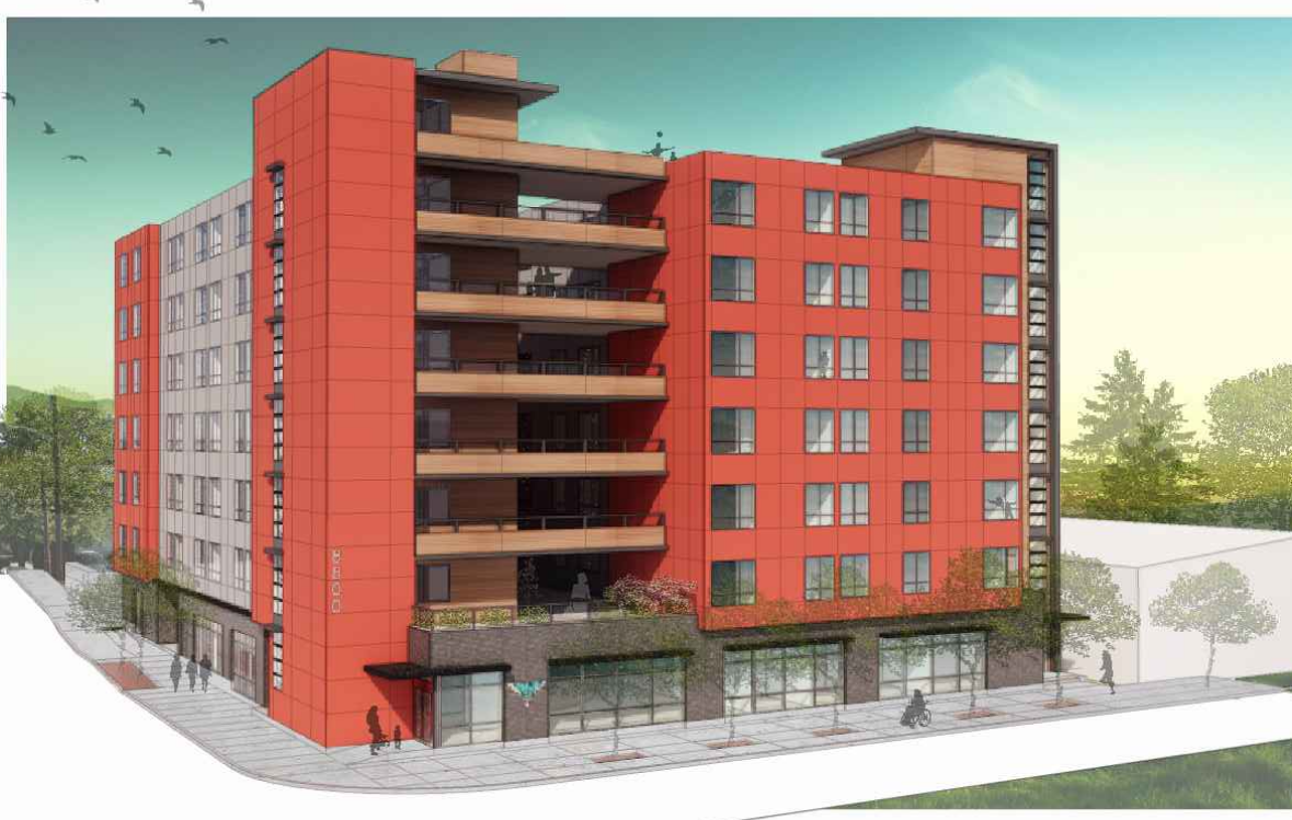 Seven-story mixed-use structure with an outpatient medical office on the first floor (no medical gases), 39 affordable apartments at <30% AMI, 39 at <50% AMI on floors 2–7, and a rooftop deck with a youth soccer field.